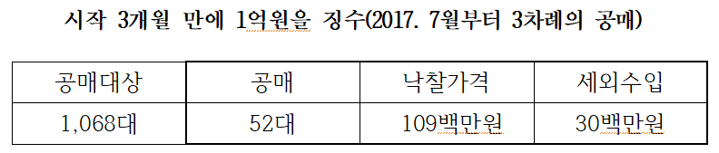 대덕구는 단지 20~30만원에 폐차장에서 처리되던 체납차량을 3개월 만에 3차례의 공매를 통해 52대를 공매하여 1억900만원의 타 지역 자동차세를 징수하고 대덕구도 징수촉탁수수료 3천 만 원(30%)의 세외수입을 거뒀다.
