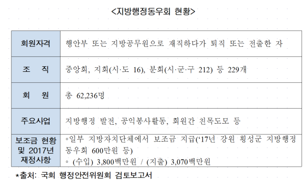 지방동우회는 전국 6만2200여명 회원이 가입한 단체다. 주요사업은 △지방행정 발전 △공익봉사활동 △회원 간 친목도모 등으로 모호하고 광범위하다.