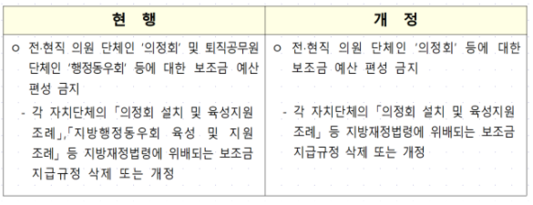 기존 예산편성기준은 전・현직 의원 단체인 ‘의정회’와 함께 퇴직 공무원 단체인 ‘행정동우회’에 지자체 예산인 보조금을 편성하지 못하도록 규정하고 있었다. 이번 행정안전부 지침으로 예산편성 배제 단체는 의정회만 남게 됐다.
