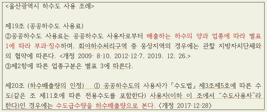 이것이 가능했던 것은 ‘울산광역시 하수도 사용 조례’ 제20조4항에 “공공하수도의 사용자가 「물환경보전법」 제38조의2에 따른 폐수량 측정기기를 설치한 경우에는 그 기기에 의해 측정된 폐수량을 하수배출량으로 볼 수 있다”고 돼 있기 때문이다.