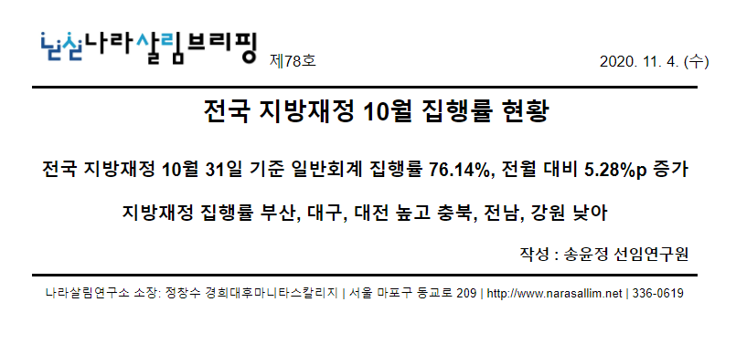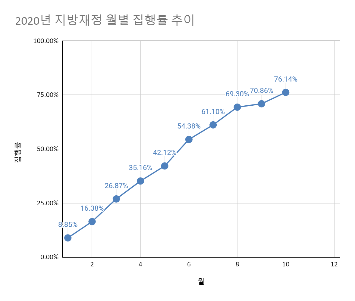 코로나19로 인한 경제위기 상황에서 재정의 역할이 크게 강조되고 있는 바, 2020년 10월 31일 기준 전국 지방자치단체의 집행률 현황을 분석함.