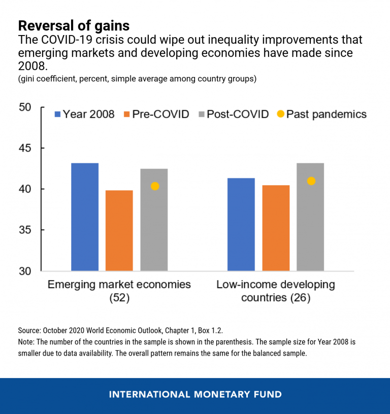 이것이 우리에게 말해주는 것은 코로나19가 소득 분배에 미치는 영향이 과거의 유행병보다 훨씬 더 클 것으로 추정된다는 것이다. 이것은 또한 글로벌 금융위기 이후 달성한 신흥시장국과 저소득 개발도상국의 상승세가 반전될 수 있다는 증거도 제시한다. 분석에 따르면 신흥시장과 개발도상국의 평균 지니계수가 200년 수준에 버금가는 42.7%까지 오를 것이라고 한다. 2008년 이후 더딘 진전을 보이고 있던 저소득 개발도상국에 대한 영향은 더 클 것이다.
