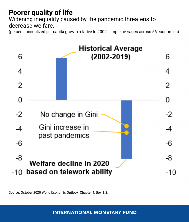 코로나19 대유행은 신흥시장과 개발도상국에서 복지를 8%까지 감소시킬 수 있는데, 그 감소분의 절반 이상은 개인의 재택근무 능력에 따른 불평등의 급격한 변화에 기인한다. 단, 이 추정치는 코로나19 대유행 이후 소득재분배 조치를 전혀 반영하지 않는다는 점에 유의할 필요가 있다. 이는 각국이 보다 일반적으로 정책행동을 통해 불평등과 복지에 미치는 영향을 위축시킬 수 있다는 것을 의미한다.